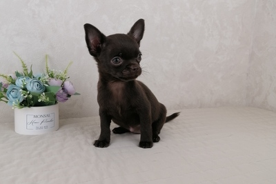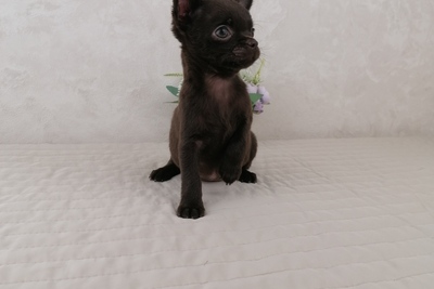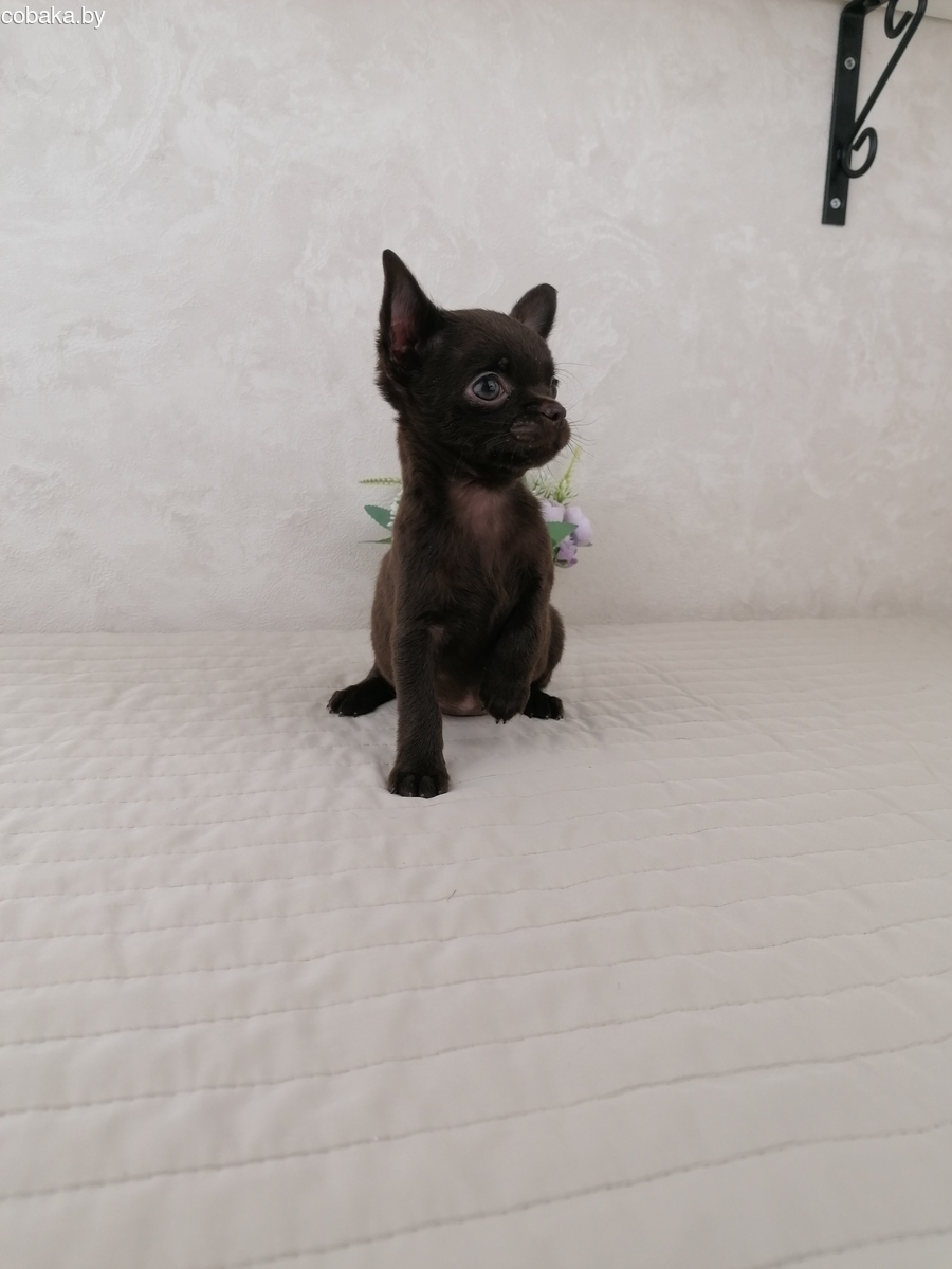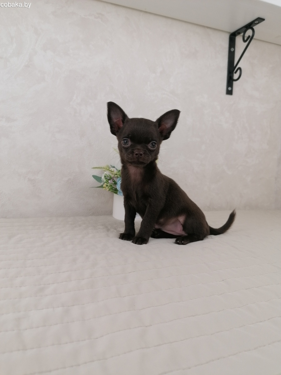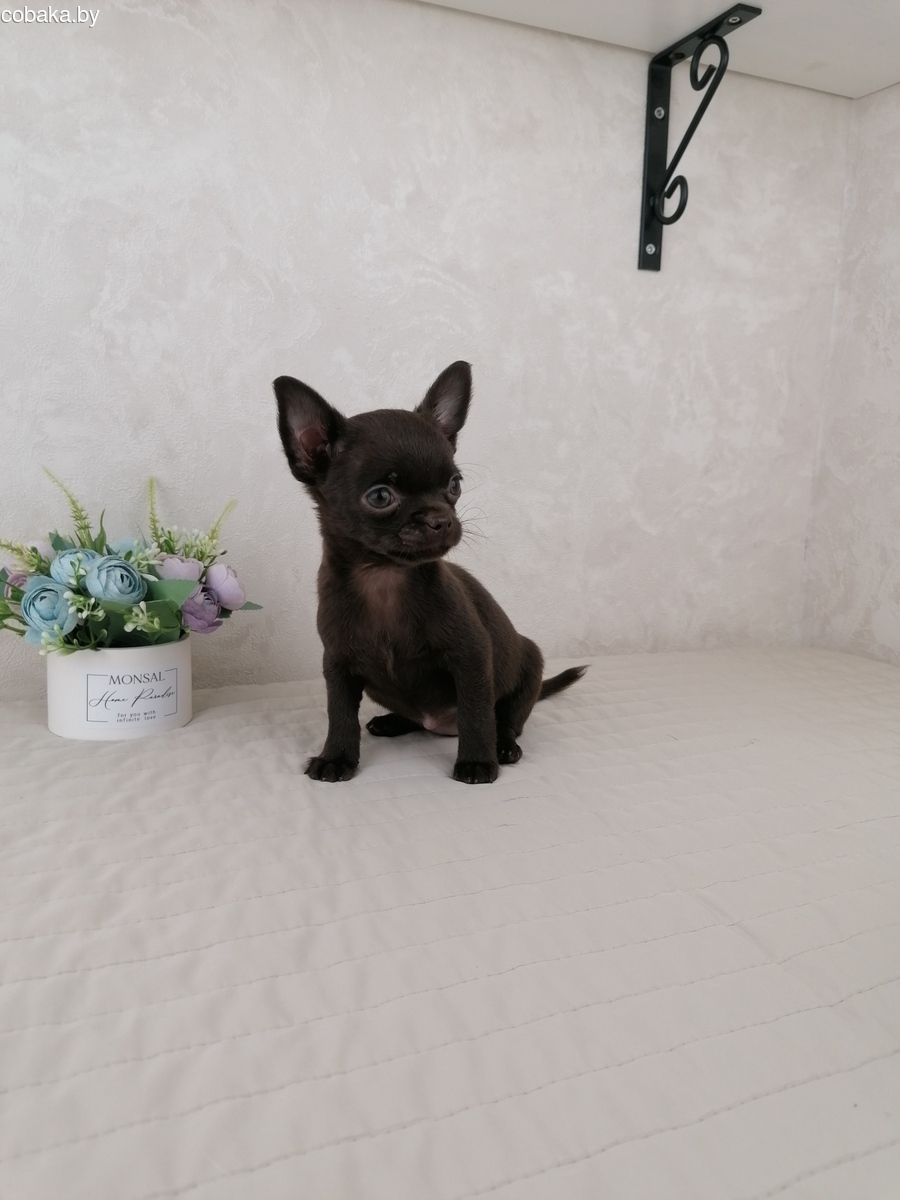 Шоколадная девочка Чихуахуа с зелёными глазами,короткошерсная. Ходит на пеленочку и лоток. Кушает как корм так и натуралку. 950р. Подробнее по тел или месенджеру. Возможна доставка