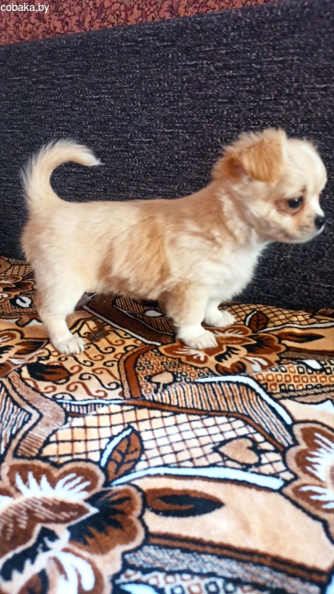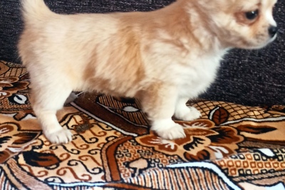Девочка чихуахуа,два месяца, стандарт,сейчас окрас крем,но темнеет, возможно будет светло рыжая.,длинношерстная,без брака, цена 850 руб.подробнее по телефону.