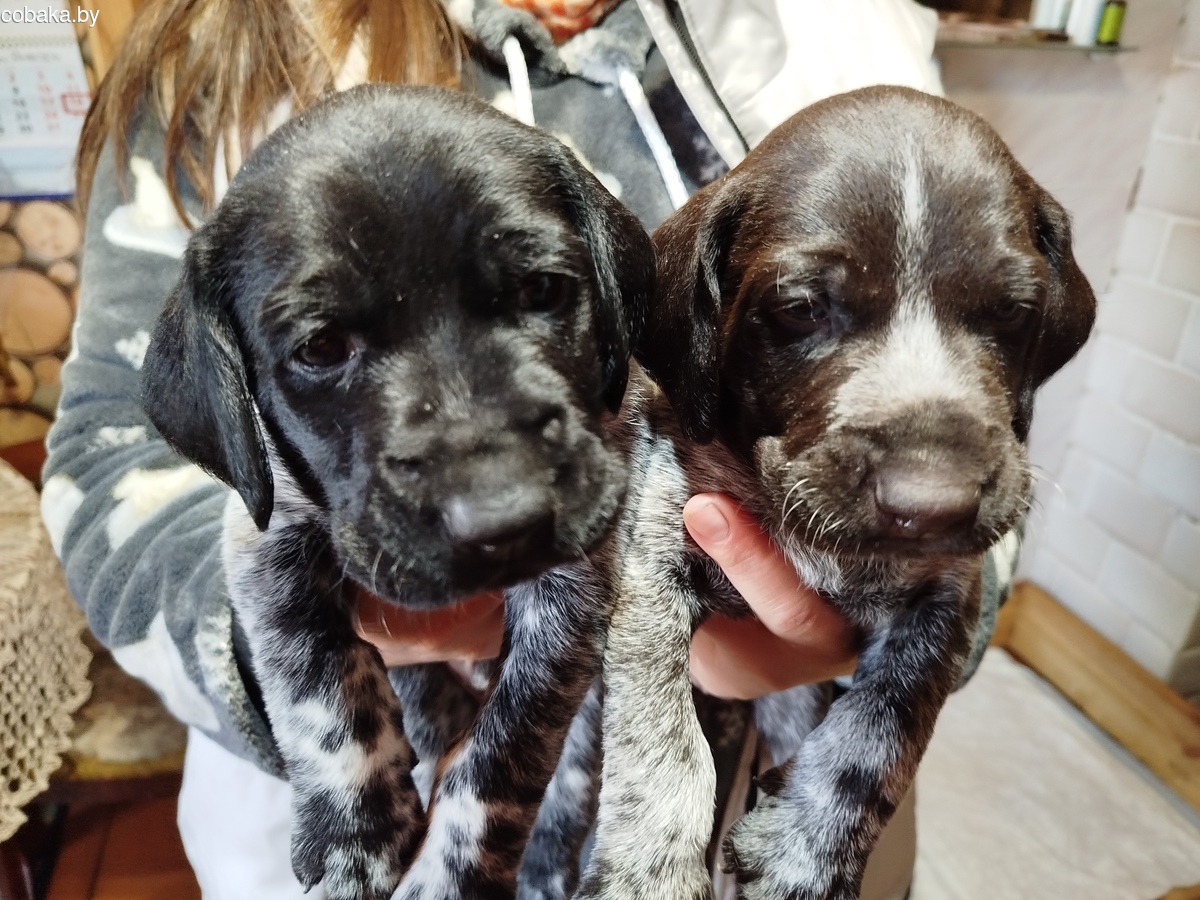 Предлагаются к бронированию щенки дратхаара. Остались три кобелька: два чёрно-пегих, один коричнево-пегий. Родились 17.02.2026 от рабочих дипломированных родителей. Родословные готовятся.