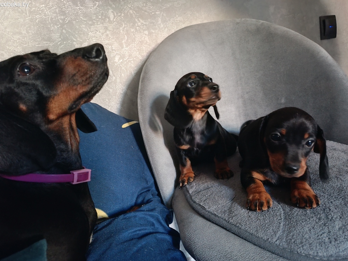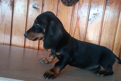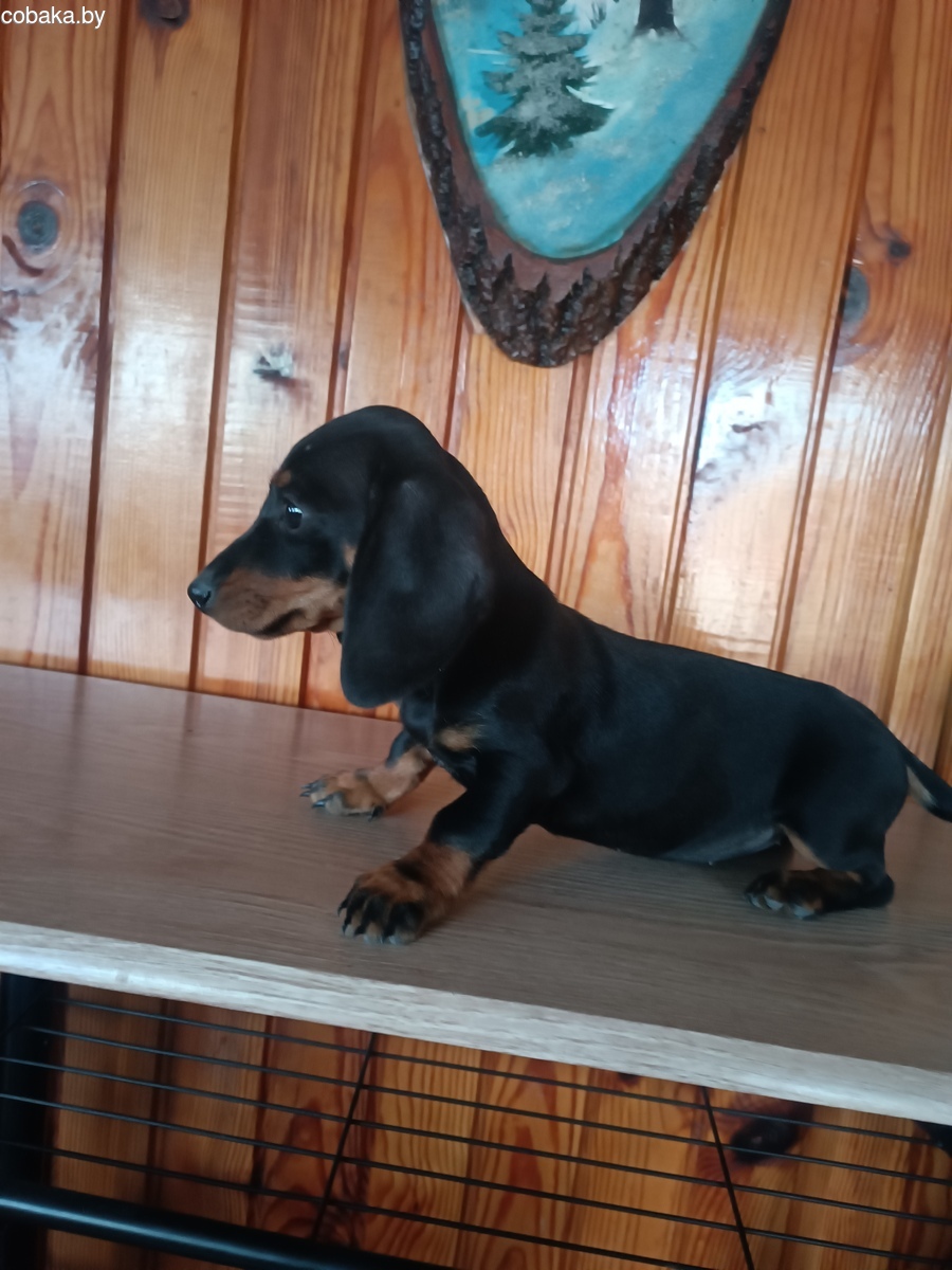 Щенок мальчик чёрного подпалого цвета. 2 мес. Мама - мини, 5 кг. Папа - кроличий, 4 кг. Приучен к пеленке. В марте проведена обязательная ветеринарная обработка - дегельминтизация путем введения перорально суспензии для щенков, первично и повторно.